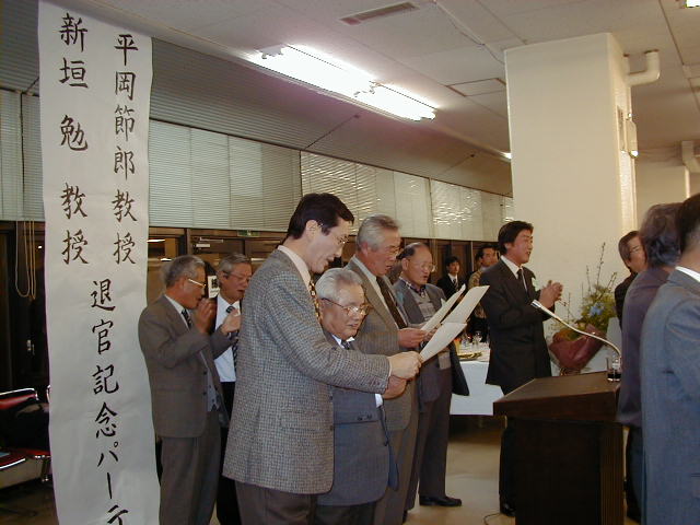 博士学位取得者(S49松浦、S51池野、S51松田、S56亀井、H12大石)からのお祝い(S51池野さん)
