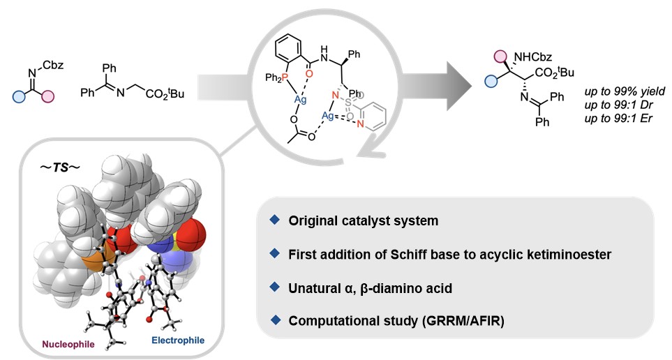 | 124) | Design of Phosphine-Heteroarenesulfonamide Ligands as Dinuclear Silver Catalysts for Enantioselective Construction of α,β-Diamino Acids Yuka Iizuka, Sayuri Okajima, Yamato Ueno, Tsunayoshi Takehara, Takeyuki Suzuki, Satoshi Maeda, Shuichi Nakamura* Journal of the American Chemical Society, 2026, 148(2), 2600-2608. [Abstract] Published December 11, 2025 doi: 10.1021/jacs.5c18426 [プレスリリース] ![]() ![]() 新しく設計したキラルジアミンにホスフィンとヘテロアレンスルホニル基を導入し、銀の2核錯体として使用してアミノ酸前駆体とケチミノエステルを反応させ、直接連結型のアミノ酸を高立体選択的に合成しました。 触媒設計には、AFIR(GRRM)を用いて行いました。 |