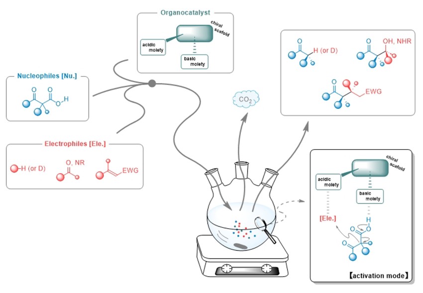 Acid Half Oxyesters to Isatins Kazuki Fujita, Ibuki Kumazawa, Jyunpei Yokoi, Kazuki Abe, Tsunayoshi Takehara, Takeyuki Suzuki, Naoki Yasukawa, Shuichi Nakamura* Advanced Synthesis & Catalysis 2024, 366(3), 438-443. [Abstract] published February 19, 2024 [Synfacts] doi: 10.1002/adsc.202301100 ![]() アミノマロン酸エステルのケトンへの脱炭酸型アルドール反応の開発に成功しました。 ケトン類へのこの求核剤の立体選択的付加反応の初めての成功例です。 反応機構が、脱炭酸過程が立体制御に主要因を果たすというこれまでにない反応機構をDFT計算で示すことに成功しました。 |