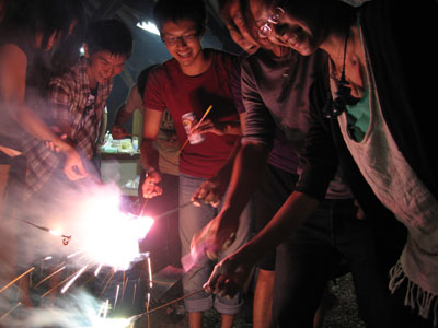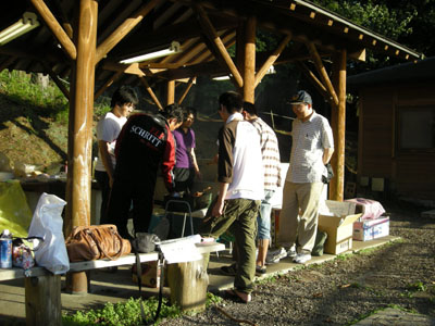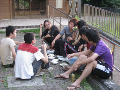 大谷教授の指導のもと火を熾す研究室の学生達