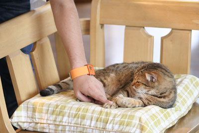 小さなネコと戯れる人