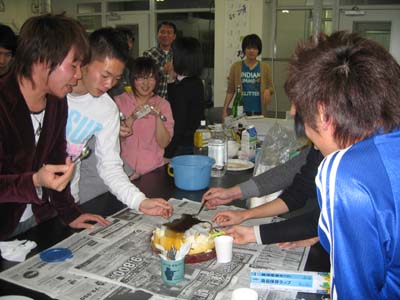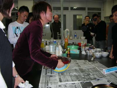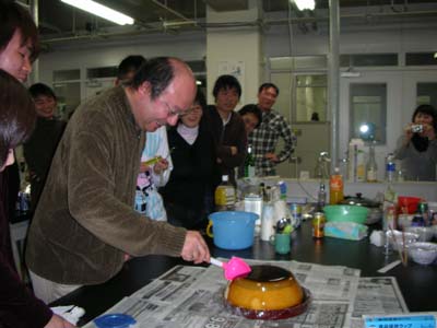プリン誕生の瞬間。全員が興奮して注目。
