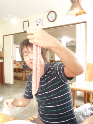 長〜〜いソーセージ。ここからねじって短くして、ゆでます。