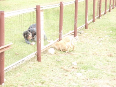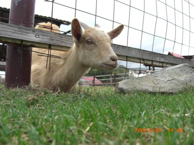 金網の下から顔を出す山羊(♂?♀?)。虹彩も含めてなかなかにかわいい。