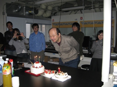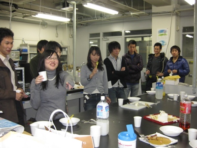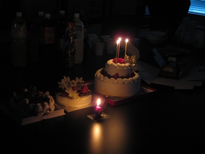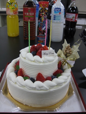 クリスマスケーキ@クリスマスイブ 昨年に引き続き、クリスマスケーキ会。 一個増えているような・・・ 結婚式以外で多段(二段)ケーキを見たのは初めてかもしれない。 その他のメンバー。個性豊か。 なんだか怪しい雰囲気 昨年に引き続き炎を吹き消す大谷先生。 あっという間に消滅しました。 commented by Kitagawa