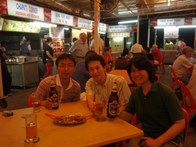 屋台にはもちろんビールが不可欠です。テーブルの上の料理は牡蠣の卵炒め。美味しい。