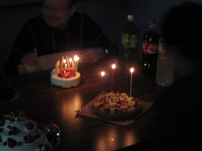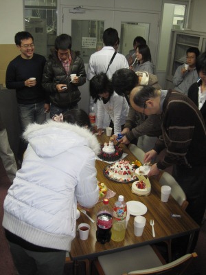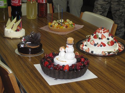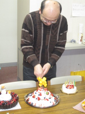 クリスマスケーキ@クリスマス(イブ)4 恒例になった、クリスマスケーキ会。 今年はケーキが5個。なんか年々増えているような・・・ ちなみに、この巨大ケーキは学生さんの手作りです。 取りあえず2個だけローソクに点火し、大谷先生が奥、手前は北川が吹き消しました。 大谷先生によるケーキ入刀。 昨年よりグレードアップして、ナイフに本物のリボンが巻いてあります。 ケーキに群がる人々。それなりの量があったのですが短時間で消え失せました。 commented by Kitagawa