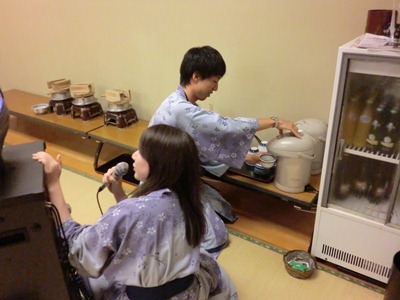 座り込んでカラオケ&マイペースでお茶を注ぐ人々。