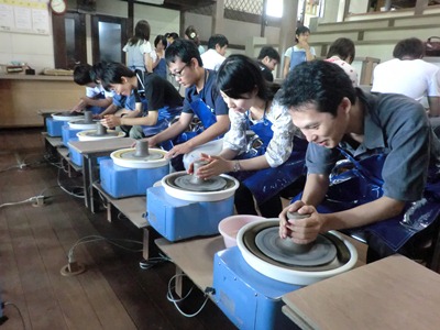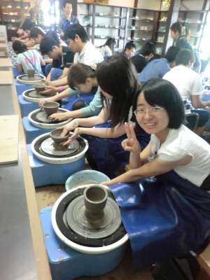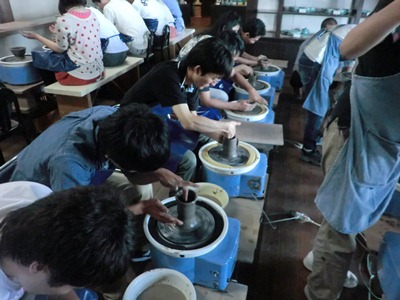 参列に並んで一斉にろくろをまわし、形作りに悪戦苦闘七転八倒します。