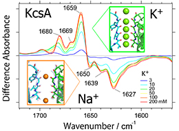 | カリウムチャネルKcsAの結晶構造 | イオン結合誘起の赤外差スペクトル |