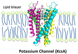 イオンチャネルは細胞膜に存在し、膜電位の変化やリガンドの結合などにより開閉することで、Na+やK+などのイオンを選択的に透過して、神経細胞や筋肉、心臓など様々な器官のはたらきに重要な役割を果たしています。これまでカリウムチャネルやマグネシウムチャネルのイオン選択機構について、全反射赤外分光法を用いた研究を行ってきました。イオンとタンパク質の相互作用はタンパク質の機能調節に関わっていることから、これからも様々な研究を行っていく予定です。