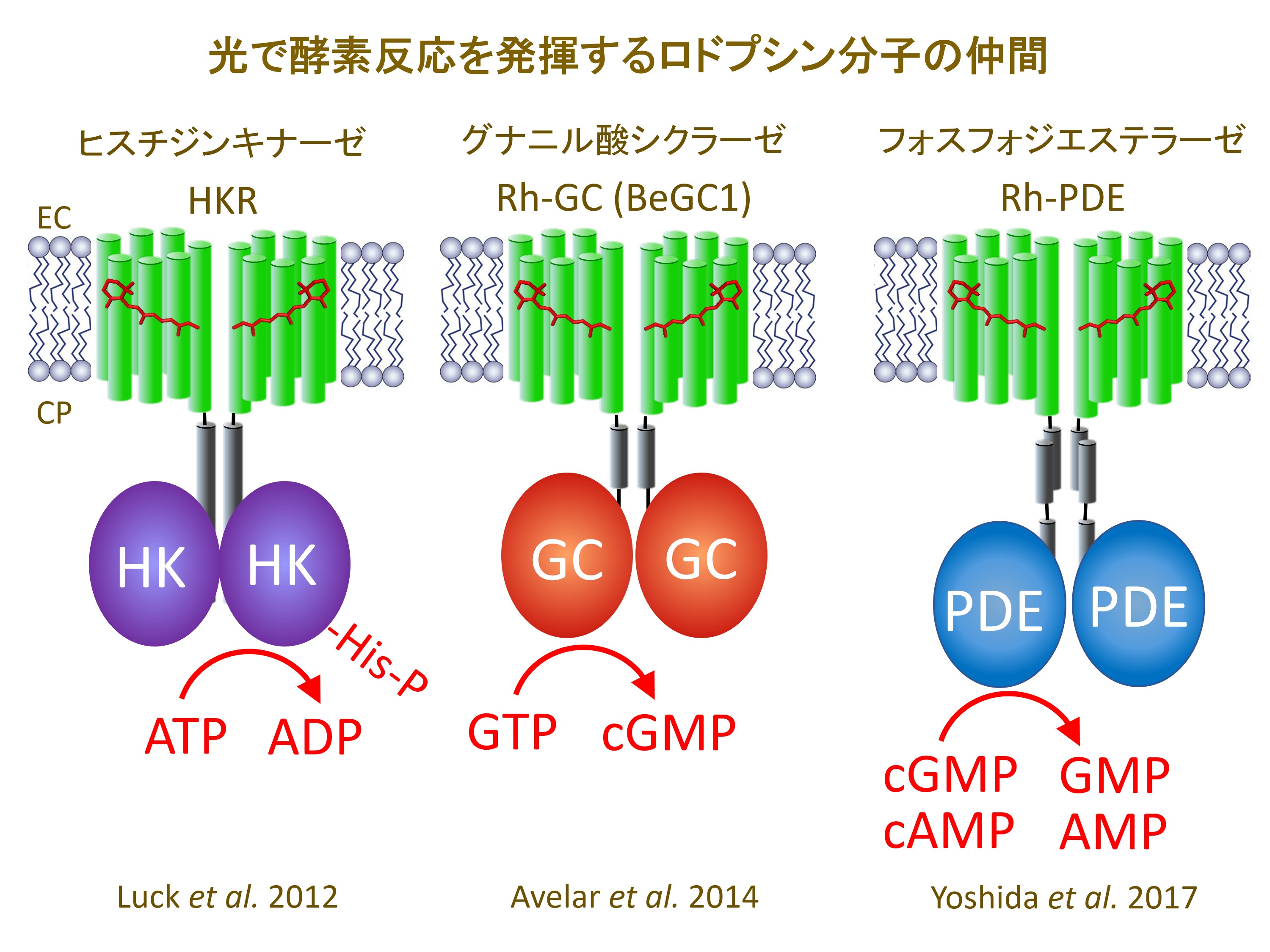 特に近年では、チャネルロドプシンやイオンポンプ型ロドプシン等のイオン輸送性光受容体に加え、酵素型ロドプシンや光受容型アデニル酸シクラーゼ(PAC) と呼ばれる光スイッチ型酵素分子の分子機構を明らかにし、オプトジェネティクス応用への貢献を目指しています。酵素型ロドプシンとは光を照射すると酵素活性を発揮する今までにないロドプシンの仲間です(下図)。例えば、光受容に伴いサイクリックヌクレオチド (cGMP)を合成する、光スイッチ型グアニル酸シクラーゼ(Rhodopsin-GC, BeGC1) が2014年に菌類から発見されました。逆に光でサイクリックヌクレオチド (cAMP, cGMP) を分解する分子 (ロドプシン フォスフォジエステラゼ、Rh-PDE) は私たちの研究室が2017年に世界で初めて報告しました。これら酵素型ロドプシンを哺乳類などの細胞へ発現させることで、光照射による細胞内シグナル伝達操作が可能になります。 また、2018年に世界に先駆けて報告した新型光受容体であるヘリオロドプシンも、新たなオプトジェネティクスへの貢献が期待されます。