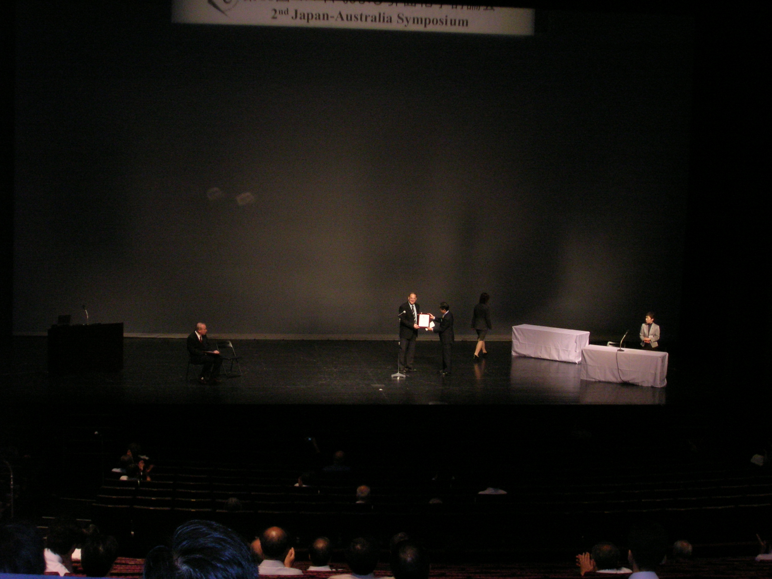 信州大学正門 荒川陽祐氏の発表の様子 1 荒川陽祐氏の発表の様子 2 D. C. Prieve教授(Carnegie Mellon大、左側)とR. Naaman教授(Weizmann工科大、右側)の表彰式 松本城 まつもと市民芸術館