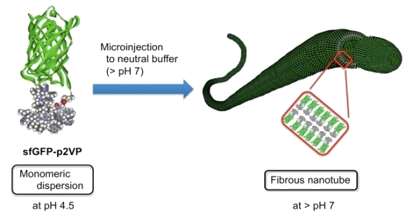 用いる蛋白質には緑色蛍光タンパク質(GFP)を用い、GFPのC-末端側にリンカーとなる数残基のペプチド配列を介して水溶性のp2VPを導入しました(GFP-p2VP、図1)。考えられる集合形態は色々とあったのですが、ここではマイクロシリンジを用いナノチューブ状に集合させる検討を試みました(図2)。pH4.5のバッファー水溶液中に溶解しているGFP-p2VPを、pH7のバッファー水溶液中にインジェクトし、溶液中の動的光散乱(DLS)測定を行ったところ、ナノチューブ化されなかった10