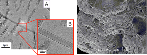 | 図3GFPナノチューブのTEM画像(左)とSEM画像(右) | 図4GFPナノチューブの位相差顕微鏡画像(左)と 蛍光顕微鏡画像(右) |