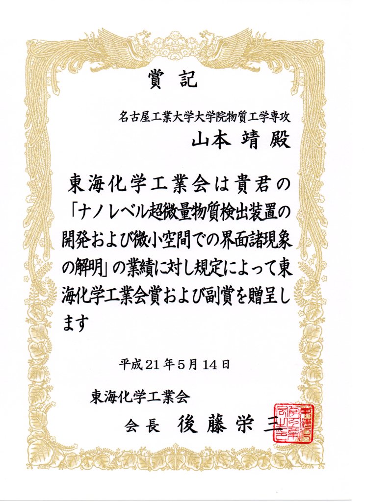 平成20年度第44回東海化学工業会賞(学術賞)が平下恒久助教(柴田哲男教授推薦)と山本靖助教(吉野明広准教授推薦)に贈られました。