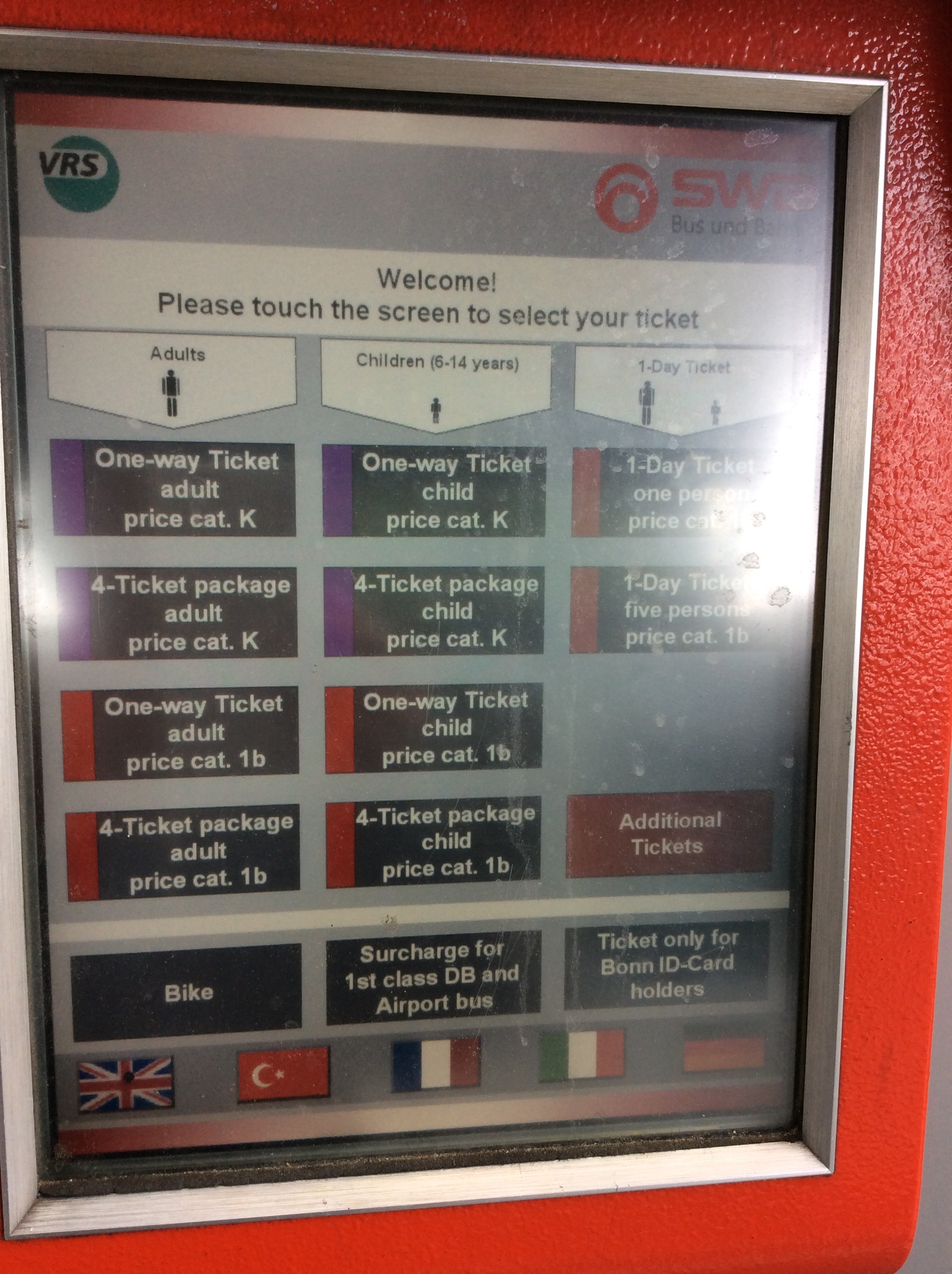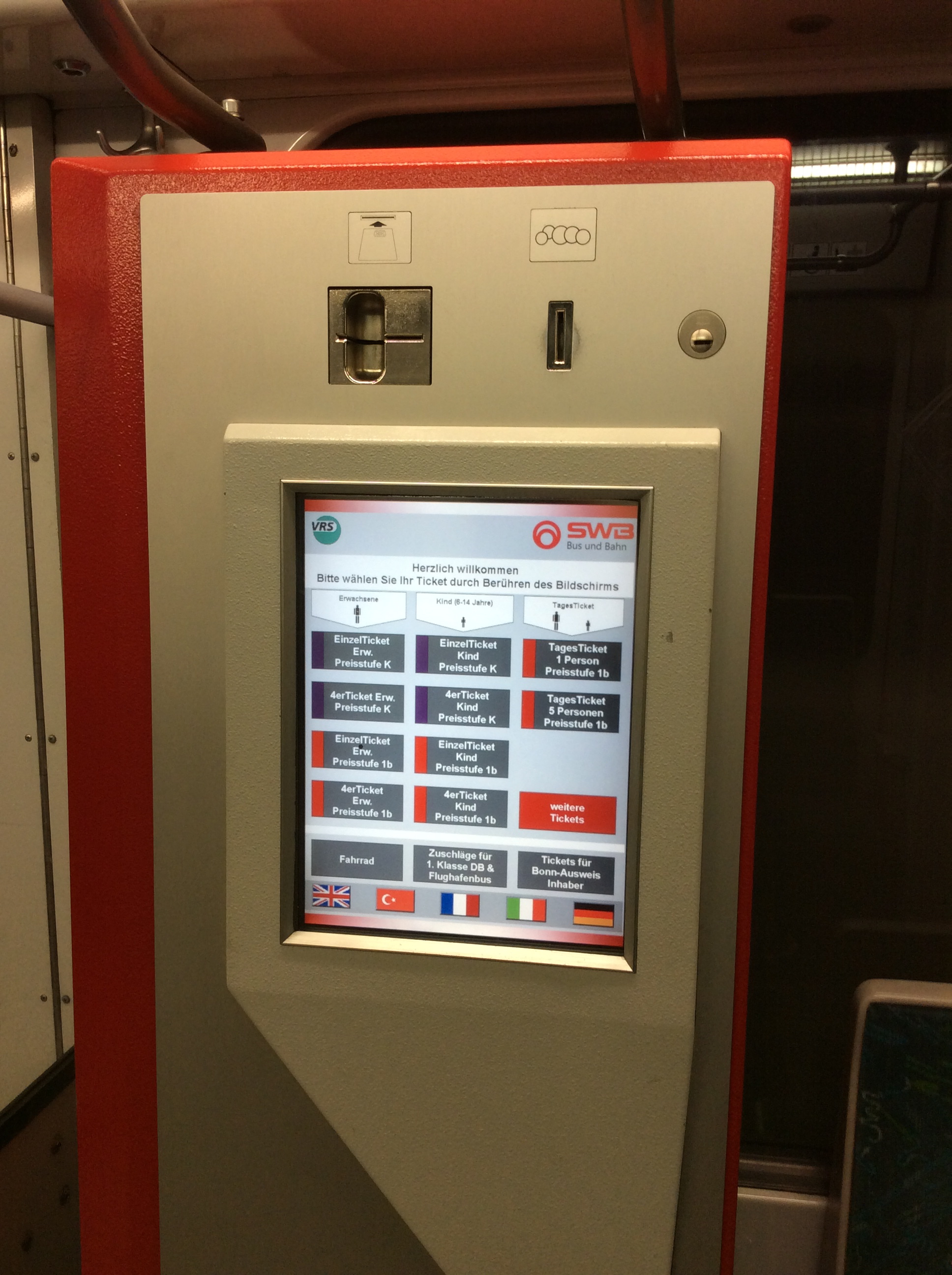 電車内にも券売機が設置されている。自己責任に任されているが、無賃乗車がバレた場合、40ユーロの罰金!
